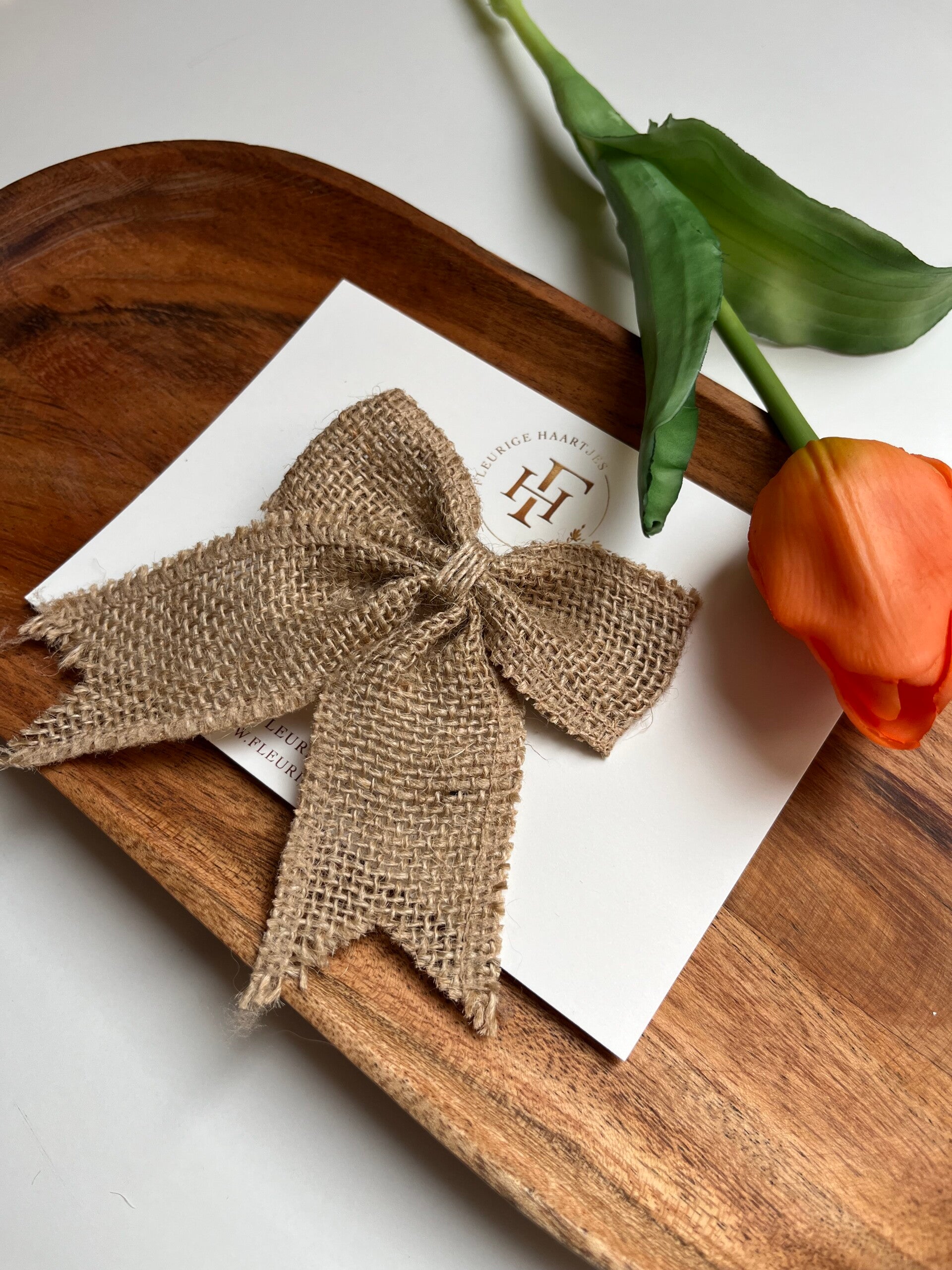 Deze grote strik van jute zit op een alligator clip van 5 cm